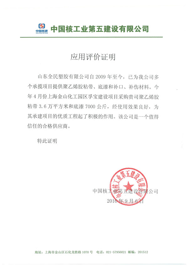 山東全民塑膠有限公司自2009年至今,已為我公司多個承攬項目提供聚乙烯膠粘帶、底漆和補口、補傷材料。今天4月份上海金山化工園區孚寶建設項目采購貴司聚乙烯膠粘帶3.6萬平方米和底漆7000公斤,經使用效果良好,為其承建項目的優質工程起了積極的作用。該公司是一個值得信任的合格供應商。